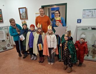 Die Sternensinger mit Stadtratsvorsitzendem Michael Hayn und Geschäftsbereichsleiterin Ulrike Findeisen vor dem gesegneten Büro.