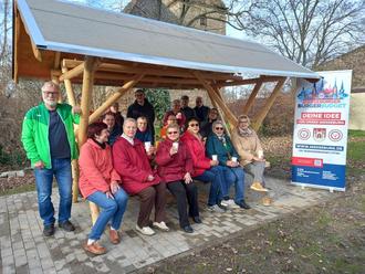 Mitglieder des Heimatvereins Kötzschen weihen die Sitzgruppe ein