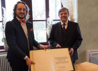 Es war ein besonderer Moment für Christian Simonis. Neben vielen bekannten Namen aus Politik, Wissenschaft, Kultur, Trägern der Bürgermedaille der Stadt Merseburg und sich in besonderer Weise für die Stadt Merseburg engagierte Persönlichkeiten steht nun auch sein Name im Goldenen Buch der Stadt. Mit diesem Eintrag würdigt die Stadt sein Engagement in Erinnerung an den Merseburger Komponisten Richard Eilenberg. Für OB Sebastian Müller-Bahr war es die Gelegenheit, ganz herzlich DANKE zu sagen - auch für die Übergabe eines Verzeichnisses der im Internet veröffentlichten Werke von Richard Eilenberg. Mit dem von Christl Gilson erarbeiteten Verzeichnis hat man jederzeit ein wunderbares Klangbeispiel zum Komponisten zur Hand!