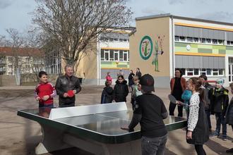 Und von dieser direkten Demokratie konnten circa 220 Kinder, die aktuell an der Grundschule „Joliot Curie“ lernen, profitieren. Sie haben seit dem 22. März 2023 eine weitere Attraktion auf ihrem Schulhof: eine Outdoor-Tischtennisplatte, die für viel Spiel und Spaß in den Pausen sorgt.