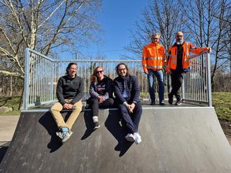 Der Skatepark am Gotthardteich hat ein neues Highlight: Am 19. März wurde die neue Halfpipe offiziell durch OB Sebastian Müller-Bahr, Stadtrat Marcus Turré, die Streetworker Jenny Cornelius und Max Wozny sowie Gerd Heimbach und Uwe Kowalski vom Straßen- und Grünflächenamt freigegeben.