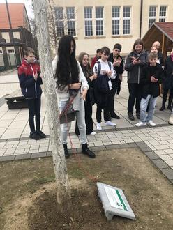 Nach der Feierstunde haben wir eine Baumpatenschaft übernommen. Dazu versammelten wir uns auf dem Schulhof und enthüllten an unserem “Patenbaum” eine kleine Gedenkplatte, die uns nun an die zehn Jahre des deutsch-französischen Schüleraustausches erinnert. Anschließend haben wir mit einem deutsch-französischen Buffet gefeiert, welches von uns und anderen Französischklassen vorbereitet worden war.