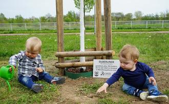 Nach einer Winterlinde, einer Silberlinde und einer Zerreiche ist es diesmal wieder eine Silberlinde, die für alle 783 Babys gepflanzt wurde. „Das geht schon in Richtung Wald“, so Oberbürgermeister Sebastian Müller-Bahr angesichts der mittlerweile vier Lebensbäume. Zum Termin waren Lennox, der als eines der ersten Babys 2022 geboren ist, und Karl Ansgar, der mit dem 22.02.2022 einen ganz besonderen Geburtstag hat, mit ihren Eltern stellvertretend für alle im Vorjahr geborenen Kinder dabei.