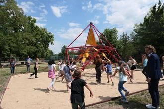 Das ging schnell: "Eins, zwei, drei" riefen die Grundschüler:innen der Geiseltaltorschule gemeinsam mit OB Müller-Bahr und das Absperrband war schnell zerrissen. Frei war der Weg zur neuen Kletterspinne, die sofort lautstark erobert wurde. Die Kletterspinne ist eines der neuen Spielgeräte, die mit Hilfe von Fördermitteln im Schulinnenhof aufgestellt werden konnten. Zwei weitere konnten ebenfalls voller Freude in Besitz genommen werden: ein Basketballkorb und ein Balancierseil. Alles zusammen kostete 30 000 €. Neben der Anschaffung der neuen Spielgeräte wurden durch die Stadtverwaltung auch dringend notwendige Erhaltungsmaßnahmen erledigt.