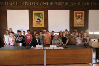 Vor der Sitzung hatten die Grundschüler:innen die Chance, Merseburger Schätze kennenzulernen. OB Müller-Bahr brachte die Kinder zum Staunen, als er über die Geheimfächer seiner Amtskette berichtete und einen Einblick in das Goldene Buch der Stadt ermöglichte. Unzählige, spannende Fragen wurden an ihn gerichtet, die er geduldig eine halbe Stunde lang beantwortete. Dabei erfuhren die Schüler:innen, dass er erst kürzlich das Goldene Sportabzeichen ablegte, kein Fußball mag, viel Fahrrad fährt und eigentlich mal Architekt werden wollte. Letzteres ist er ja auch irgendwie - ein Architekt im Sinne der Verantwortung für die Gestaltung und Entwicklung von Merseburg.