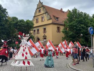 Und das was uns alle immer wieder begeistert: Der traditionelle Schlossfestumzug auf neuer Streckenführung. Am Rande der Festumzugsstrecke standen so viele Besucher:innen. Es war einfach nur ein toller Anblick, die Innenstadt vor allem auf dem Entenplan mit so viel begeisterten Zuschauern zu sehen. Den besten Ausblick hatten die Anwohner:innen aus ihren Fenstern auf den grandiosen Umzug, der in diesem Jahr drei Bilder aus der Geschichte Merseburgs zeigte.