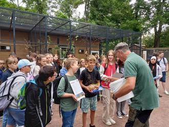 Einen interessanten Projekttag haben Schüler:innen der fünften Klassen der Gemeinschaftsschule J. G. Borlach aus Bad Dürrenberg in der letzten Schulwoche vor den Sommerferien verbracht. Alle drei Klassen hatten den Wunsch, gemeinsam den Merseburger Südpark zu erkunden. Und nicht nur das. Zu Beginn ihrer Besichtigungstour haben die Kinder ihre Tierpatenschaftsurkunden vom Leiter des Südparks Matthias Rudolph erhalten. Sie übernehmen je Klasse für ein Jahr eine Patenschaft für eine Bahamaente, eine Moorente und eine Mandarinente und sichern damit ein Teil des Futters für die Enten ab. Mit einem Lächeln übergab Matthias Rudolph aber auch Futter für die Schüler:innen. Die sechs Vertreter:innen der drei Klassen, die stellvertretend die Urkunden in Empfang nahmen, bekamen Gummibärchen für diesen Tag geschenkt. Nach der Übergabe der Urkunden starteten alle zur großen erlebnisreichen Besichtigungstour und staunten, was der Südpark mit seinen Tieren und Attraktionen zu bieten hat. Alle waren begeistert und werden mit ihren Familien und Freunden auf jeden Fall wiederkommen. Die Sommerferien sind dazu die passende Gelegenheit.