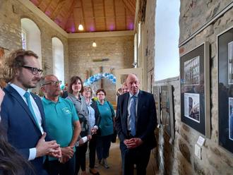 Eine Delegation der Partnerstadt Bottrop unter Leitung des Oberbürgermeisters Bernd Tischler (SPD) weilte anlässlich der Schlossfestspiele in Merseburg. Im Rahmen des Besuchsprogramms informierten sich die Gäste über den Stand des Wiederaufbaus der Hoppenhauptkirche im Ortsteil Beuna. Ortsbürgermeisterin Rosel Mißberger (CDU) und Vertreter des Vereins luden zur Besichtigung ein, informierten über den erfolgreichen Wiederaufbau mit Hilfe und Unterstützung durch Vereinsmitglieder, des großen Engagements vieler Bürger:innen und regionaler Unternehmen sowie über die vielfältige Kultur in der Kirche. Thema war auch das Projekt "Merseburger Bürgerbudget", mit dessen Hilfe die Hütte im Außenbereich aufgestellt werden konnte. OB Bernd Tischler: „Unsere Spende für den Verein kommt von ganzem Herzen. Wir wollen damit wertschätzen, was der Verein für die Erhaltung dieses wunderbaren Kulturgutes geleistet hat.“ Der Verein, der in diesem Jahr sein 20jähriges Bestehen feiert, und die Stadt Merseburg sagen ganz herzlich DANKE.