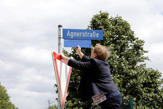 Im Rahmen der Aktion des Altstadtvereins „AHA-Effekt am Straßeneck“ brachten Schilderpatin Katja Finger und Stadtrat Marcus Turre Zusatzschilder an. Die Agnerstraße, die sich im Gewerbegebiet Merseburg-Nord befindet, wurde benannt nach einer Merseburger Bildhauerfamilie der Barockzeit. Katja Finger sponserte für diese Straße das Zusatzschild.