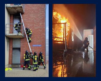 Geübt wurde vor Ort unter anderem das Verhalten, wenn der Rückzugsweg versperrt wird (eigene Rettung über eine Leiter), das Absuchen von Räumen nach vermissten Personen, die rechtzeitigen und richtigen Funkmeldungen an die Führungskräfte sowie Lösch- und Ventilationstechniken: Wie können Wasserschäden vermieden und dennoch ein Löscherfolg erzielt werden? Wie bekommt man Rauch aus dem Raum?