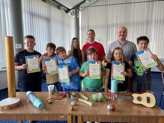 Dazu gehörten die selbstgebastelten Musikinstrumente aus den verschiedensten Materialien mit dem Ziel, Geräusche zu erzeugen. Emely zeigte z.B. ihre Rassel, die sie aus einem Ast, Flaschendeckeln und Holzperlen angefertigt hat. Vincent präsentierte einen sogenannten Regenmacher - ein mit verschiedenen Materialien gefülltes Papprohr, mit dem bei Bewegung Geräusche entstehen. Die verschiedenen Töne wurden aufgenommen, so z.B. auch das beim Blättern von Buchseiten entstehende Geräusch.