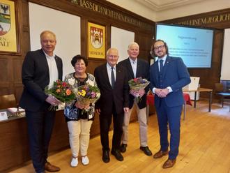 Präsidium des Stadtrates Michael Hayn (l.), Marion Galander und Dr. Lutz Kuhne mit OB Müller-Bahr(r.) und das an Jahren älteste Ratsmitglied, Prof. Dr. Merbach (Mitte)