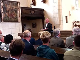 Vor der Sitzung im Alten Rathaus begrüßte Dompfarrer Bernhard Halver gemeinsam mit Oberbürgermeister Sebastian Müller-Bahr die Stadträte und Räte der Ortschaften Beuna, Geusa, Meuschau und Trebnitz im Rahmen einer feierlichen Zeremonie in der Stadtkirche St. Maximi. Die Stadtkirche hat eine naheliegende Rolle in der Geschichte der Stadt Merseburg. Sie war traditionell die Ratskirche und somit die Kirche der Ratsherren und des Bürgermeisters. Bis vor etwa 100 Jahren hatte auch der erste Ratsherr, heute der Stadtratsvorsitzende, die ehrenvolle Aufgabe, den ersten Pfarrer für die Stadtkirche zu berufen.