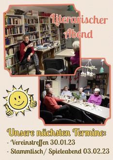 Ein heiterer literarischer Abend mit vielen Impulsen sorgte am 14.12.2022 für eine vorweihnachtliche Stimmung in unserer Bücherstube. Carolin Beutler begeisterte wieder mit humorvoller Darbietung die Zuhörer. Selbstgebackenes von Ingrid Gutknecht und Glühwein waren eine willkommene Beilage.