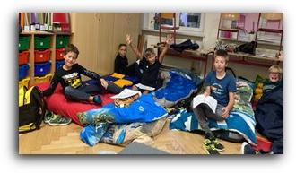Nach dem Essen kuschelten sich alle Kinder in ihre Betten und wir lasen gemeinsam ein spannendes Buch. Nach dem etwas anstrengenderen Teil folgte eine abenteuerliche Nachtwanderung durch das Schulhaus. Ausgerüstet mit Taschenlampen suchten die Kinder nach dem verschollenen Klassenmaskottchen. Die Atmosphäre war voller Aufregung und Neugier. Zum Glück wurde es gefunden!