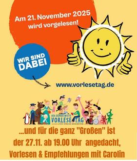 Am Freitag, dem 21. November wird ab 15:30 Uhr für 4- bis 6-jährige Kinder eine spannende Geschichte vorgelesen. Ca. 16:00 Uhr beginnt die Vorlesung für die 7- bis 10-Jährigen. Die jungen Zuhörer erwartet eine gemütliche Atmosphäre im Raum der Dorfgemeinschaft und eine kleine Überraschung.