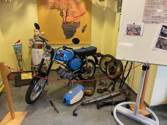 Bild 6: Ein von Schülern der GTA „Schrauben lernen-Zukunft gestalten“ wieder aufgebautes Simson-Moped schmückte an diesem Tag unseren Schulflur.