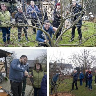 Gut besucht war auch unser Obstbaumschnitt-Seminar am 17. Februar. Jörn Scholz, Mitglied im sächsischen Pomologen-Verein, hat dabei sein Wissen weitergegeben. Welche Geräte werden benötigt? Wann schneidet man? Und welche Auswirkungen haben frühe oder späte Schnitte? All diese Fragen konnten geklärte werden. Abschließend gab es direkt eine Schnitt-Vorführung am Apfelbaum und zur Stärkung – wie sich das an einem Samstagmittag gehört – für alle der rund 15 Teilnehmer eine Roster vom Grill. Wie schon zu hören war, haben einige das Gelernte gleich in den nächsten Tagen in die Tat umgesetzt. So schön sahen die Bäume in Schönbach wohl noch nie aus! Hoffen wir, dass sie auch viel Obst tragen ...