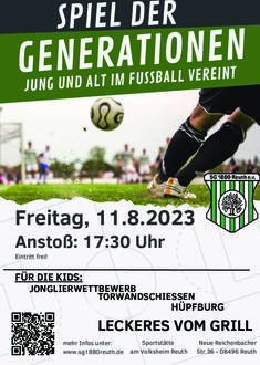Die SG 1880 Reuth e. V. veranstaltet ein spannendes Fußballspiel der Generationen am 11.08.2023. Der Anstoß erfolgt 17:30 Uhr auf dem Vereinsgelände in Reuth. Dieses einzigartige Event bietet die Gelegenheit, verschiedene Altersgruppen gemeinsam auf dem Fußballfeld zu erleben. Spieler im Alter von 14 – 99 sind herzlich eingeladen teilzunehmen und ihre Leidenschaft für den Fußball zu teilen. Neben dem sportlichen Wettkampf erwartet die Teilnehmer und Besucher ein vielfältiges Rahmenprogramm mit Verpflegung und Aktivitäten für Kinder. Wir möchten einen tollen Tag voller Spaß, Teamgeist und gemeinsamer Erinnerung schaffen.
