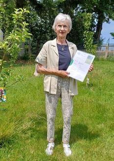 Am 18.06.2025 überreichte Frau Mothes die Patenurkunde für die Familie Luise und Dietmar Mehnert, Oberneumark, an Frau Mehnert. Auch sie haben bereits im Vorjahr im eigenen Grundstück Bäume gepflanzt. Dazu gehören neben einer Birne und einer Pflaume auch 3 Apfelbäume der alten Sorten, wie James Grieve und Cox Orange.