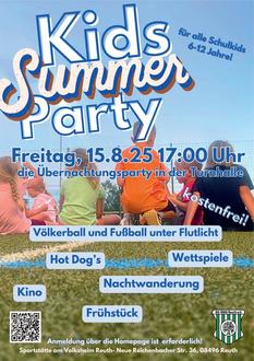 Am 15. August 2025 startet die SG 1880 Reuth e.V. ihre diesjährige Kids Summerparty – eine aufregende Übernachtung in der Turnhalle mit Spiel, Spaß und abwechslungsreichem Programm für Kinder von 6 bis 12 Jahren.
