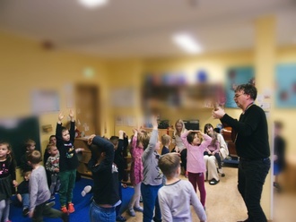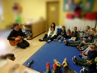 Heute besuchte uns Knut Meinel, der Pfarrer der Gemeinde Theuma/Altensalz mit einer Gitarre und einer Fülle von christlichen Liedern im Gepäck. Für eine halbe Stunde entfachte er eine wahre Begeisterung bei den „Sonnenkäfern“. Die Kinder sangen und tanzten ausgelassen zu den Klängen seiner Gitarre und hatten sichtlich großen Spaß dabei. Schnell konnten die Kinder die eingängigen Melodien mitsingen und ließen sich von der Musik mitreißen. Wir freuen uns sehr, dass wir dieses Angebot 14-täglich bei uns in der Einrichtung anbieten können.