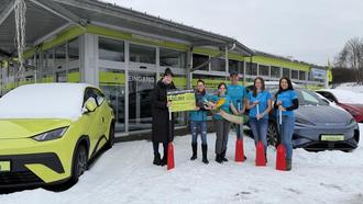 Die Lucky Loser bei der Übergabe des Gutscheins durch eine autobund-Mitarbeiterin.