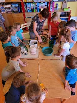 Die Vorschulgruppe vom Kindergarten Grashüpfer hatte in diesem Jahr schon viel Wissenswertes über das Thema „gesunde Ernährung“ in einem Projekt gemeinsam mit der IHK gelernt. Da passte es sehr gut, dass uns Kräuterfrau Anne besuchte und passend zum Thema Interessantes vermittelte. So lauschten wir einer Geschichte vom Spitzwegerich, gingen auf Wanderung um Kräuter zu sammeln, setzten einen Sud für Kräuterlimonade an und bereiteten einen pikanten, gesunden Brotaufstrich zu.
