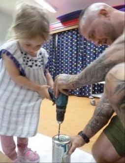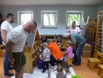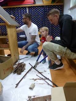 Gemeinsam füllten wir ein großes Insektenhotel. Dazu musste Hasendraht befestigt werden. Anschließend befreiten wir Ziegelsteine vom Dreck und füllten Dosen mit Stroh und Zapfen. Dieses kam auch in die Etagen vom Hotel, ebenso Hölzer und Baumscheiben. Wir hatten gut zu tun und durften sogar mit den Papas bohren mit der Bohrmaschine.