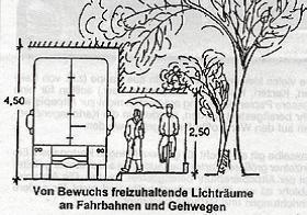 Dabei sind die in der Skizze dargestellten Maße (Lichtraumprofile) zu beachten. Über Fahrbahnen ist der Luftraum bis zu einer Höhe von 4,50 m und über Gehwegen bis mindestens 2,50 m von Ästen und Zweigen freizuhalten. Entlang von Gehwegen ist der Bewuchs bis auf die Gehwegkante zurück zu schneiden. Bei Fahrbahnen muss der Abstand zur Fahrbahnkante mindestens 0,75 m betragen.
