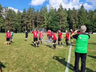 Jubel und ausgelassene Emotionen am 17.06.2023 auf dem Sportplatz in Zobes. Die Männer der Spielgemeinschaft Zobes / Theuma II grüßten nach 18 Spieltagen von der Tabellenspitze und konnten so die Meisterschaft in der 2. Kreisklasse Staffel 2 feiern. Mit 37 Punkten, einem Torverhältnis von 48:25 Toren, zwölf Siegen, einem Unentschieden und fünf Niederlagen konnten am Ende 9 Mannschaften hinter sich gelassen werden. Wie eng es in dieser Klasse am Ende zuging zeigen die Punkte der weiteren Platzierten. Den 2. Platz mit 33 Punkten und den 5. Platz mit 32 Punkten trennte nur ein Punkt. Umso höher ist die Leistung der Mannschaft anzuerkennen, die durch mannschaftliche Geschlossenheit, Können, aber auch mit etwas Glück am Ende von ganz oben grüßte. Nach dem letzten Spiel kannte der Jubel bei den Spielern keine Grenzen. Andreas Wehner vom Vogtländischen Fußballverband übergab der Mannschaft die Meisterplakette und Urkunde. Passende Meistershirts waren vorbereitet – von der Firma autobund GmbH gesponsert – und so konnten die Spieler die Saison bei Grillgut und Fassbier ausklingen lassen.