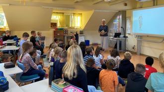 Wie jedes Jahr hielt auch diesmal der Literaturwagen an der Talsperrenschule Thoßfell. Die Kinder konnten sich auf neue Leseinspirationen freuen. Für die Klasse 1 und 2 war Herr Reinländer am Start und stellte den Kindern auf sehr anschauliche und lustige Weise eine ganz besondere Fee vor. Da gab es viel zu lachen, denn Karo Kugel war eine ganz besondere Superelfe. Diese Elfe ist rund wie eine Kugel, trägt große Filzpantoffeln und wenn sie nicht gerade herumkommandiert wie ein General beim Fahnenappell, futtert sie Kekse - eine ihrer drei großen Leidenschaften. Die Kinder hatten viel Spaß und waren so begeistert, dass sich einige gleich das Buch bestellten, um zu erfahren, wie es weitergeht.