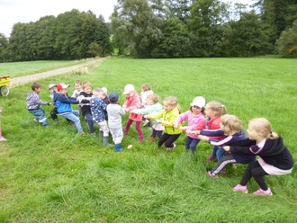 Wie die Hasen hüpften wir durchs Feld, um alle Reifen aufzusammeln und beim Tauziehen konnten wir unsere Kräfte messen. Geschicklich- und Schnelligkeit stellten wir bei verschiedenen Wettspielen unter Beweis. Selbst die Kleinsten waren mit Feuereifer dabei und probierten alles aus.