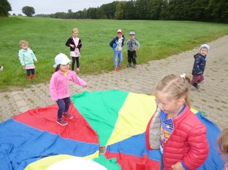 Im September zogen alle Kinder der Kita mit Bollerwagen zu einem sportlichen Wandertag los. Vorbei am Kuhstall liefen, hüpften und rannten wir bis zur Brücke. Der Platz davor bot sich super an für Wettspiele. Auf dem Schwungtuch ließen wir verschiedene Dinge tanzen und mussten schnell reagieren, wenn eine Farbe aufgerufen wurde.