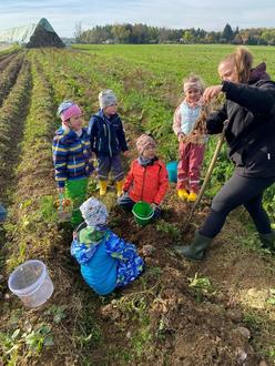 Am 17.10. brach die Maikäfergruppe früh auf, um der Frage „Woher kommen eigentlich unsere Kartoffeln?“, auf den Grund zu gehen. Dank des großartigen Einsatzes der Eltern wurde ein Ausflug zum Bauernhof der Familie Schmidt in Jößnitz organisiert. Bei strahlendem Herbstwetter erkundeten die Kinder die Umgebung und durften die verschiedenen Bauernhoftiere streicheln. Anschließend wurde den Kindern erklärt, wie Kartoffeln maschinell geerntet werden. Doch das wahre Abenteuer begann, als die Kinder mit Gummistiefeln und Eimern ausgestattet selbst auf das Feld durften. Begeistert gruben sie die Kartoffeln aus und sammelten ihre Funde voller Stolz ein. Den Kindern wurde anhand der verschiedenen Pflanzen erklärt, dass es eine sogenannte Urkartoffel gibt, die die Kraft für die Entwicklung neuer Kartoffeln weitergibt. So erhielten die Kinder die Möglichkeit, das Wachstum der Pflanzen und seine Bedeutung unmittelbar zu erleben.