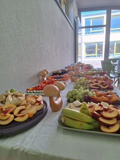 In unserer Mensa richteten wir für alle Kinder ein vielfältiges Buffet an. Uns unterstützen dabei viele Eltern mit gespendeten Lebensmitteln.
