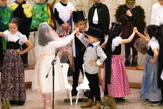 Mit deutschen und sorbischen Liedern sowie Tänzen wurde das musikalische Programm bereichert. Die Kinder sangen und tanzten mit großer Freude und begeisterten das Publikum. Zum Schluss zog die Hochzeitsgesellschaft durch das Publikum und bekam riesigen Applaus. Der Braška-Hut wurde mit reichlich mit Geld gefüllt. Gemeinsam überlegen wir uns, welche Überraschung es für die „Schauspieler“ geben wird?