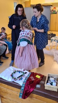 Die Erzieherinnen bereiteten die Mädchen gemeinsam mit Frau Böhme vom sorbischen Trachtenhaus Hoyerswerda auf ihren großen Auftritt vor. Es kann bis zu einer dreiviertel Stunde dauern, bis die Tracht perfekt sitzt.