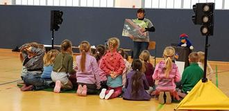 Anfang Februar besuchte der Rabe Adacus vom ADAC die Kinder der Klasse 1. Sie wiederholten ihr bereits erworbenes Wissen aus dem Verkehrserziehungsunterricht, spürten Fehler im Verhalten von Straßenverkehrsteilnehmern auf und übten sich selbst im fehlerfreien Überqueren einer Fahrbahn. Mit einer Urkunde ging jeder anschließend stolz nach Hause.