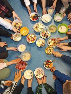 Ein Tag beginnt am besten mit einem Frühstück von und für Durchstarter. In der letzten Schulwoche vor den Ferien konnten sich die Klassen 2 und 4 im Rahmen eines Projektes zur gesunden Ernährung mit Schulassistentin Frau Zschieschang ein Power-Müsli herstellen.