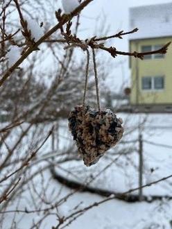 Am nächsten Tag war es dann soweit. Die Vogelfutter-Anhänger konnten an unseren Sträuchern im Garten aufgehängt werden.