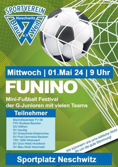 Der SV Neschwitz richtet am 1. Mai erstmalig ein Funino Turnier aus. Ein Funino Turnier ist ein kindergerechtes Fußballturnier, bei denen in den neuen Spielformen gespielt wird. Hierbei spielen die Kinder mehrere Runden zwischen 6 und 10 Minuten sehr intensiven Fußball auf einem kleineren Feld mit nur drei Spieler:innen und Minitoren. Auf- und Abstiegssysteme zwischen den kleinen Feldern sorgen hierbei dafür, dass sich Teams mit der gleichen Stärke treffen.