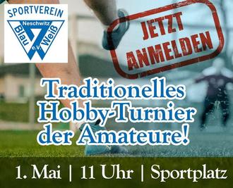 Beteiligen Sie sich am traditionellen Hobby-Fußballturnier am 01. Mai. Wir suchen freiwillige Amateur-Kicker, die bereit sind auf dem Rasen den Feiertag zu begrüßen.