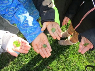 Auf dem Fischereihof angekommen, ging es auch schon gleich los. Am Anfang wurde den Kindern gezeigt mit welchen natürlichen Stoffen man Eier färben kann. Dazu wurden Birkenblätter (gelb), Zwiebelschalen (braun) und getrocknete Läuse (rot) in einem Topf als Farbsud vorbereitet. Bevor es aber losging, sammelten die Kinder draußen auf der Wiese kleine Blätter, die als Abdruck für ihr Osterei dienen sollten.