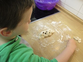 Mit etwas Geschick und gegenseitiger Hilfe schafften alle ihr gekochtes Ei mit einem aufgelegten Blatt in einem Feinstrumpf zu verknoten. Danach wurden die Eier nach Wahl in einen Topf zum Färben gelegt und dann hieß es warten. In der Zwischenzeit hatten die Kinder die Möglichkeit, ein eigenes Osterbrot zu backen. Dazu mussten sie aus drei Teigrollen einen Zopf flechten, den sie dann noch mit Rosinen, Kürbiskernen oder Mandelplättchen verzieren durften.