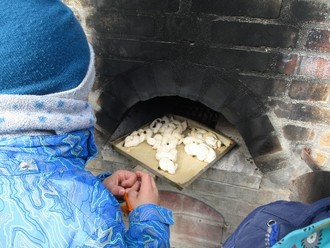 Auf mehreren Backblechen wurden dann die Brote in den vorher angefeuerten Steinbackofen geschoben.