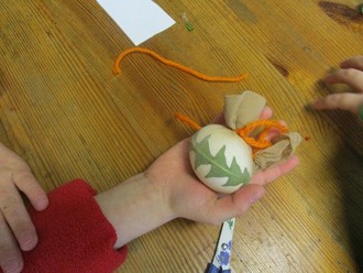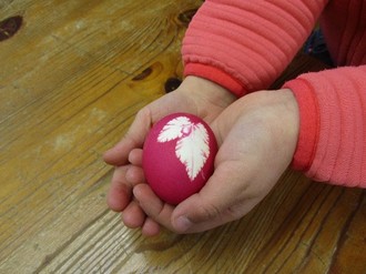 Während die geflochtenen Osterbrote schön braun wurden, konnten die Kinder nach ihren gefärbten Eiern sehen. Eins nach dem anderen wurde dann aus dem Topf geholt. Jeder konnte einzeln das Blatt abziehen und staunen, wie gut man die Struktur und die gewählte Farbe erkennen konnte.