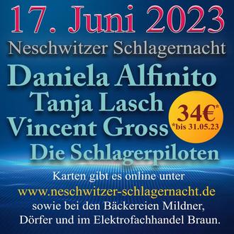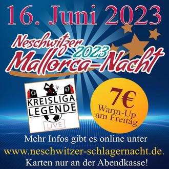 Am 17.06.2022 findet die nächste Neschwitzer Schlagernacht statt. Wir leiten das Wochenende wieder mit einem Mallorca-Abend zum Freitag ein. Live-Gast am Freitag ist Kreisligalegende. Informationen zu den Vorverkaufsstellen und einzelnen Künstlern entnehmen Sie bitte der Webseite: www.neschwitzer-schlagernacht.de.