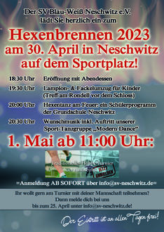 Das traditionelle Hexenbrennen wird in diesem Jahr wieder auf dem Sportplatzgelände in Neschwitz stattfinden. Besuchen Sie den Sportplatz und sehen Sie den Kindern und Tanzmädchen bei ihrem kleinen Programm zu. Vorher geht es mit einem Lampionumzug vom Schloss zum Sportplatz, wo schon der große Hexenhaufen darauf wartet von den ganz Kleinen entzündet zu werden.