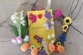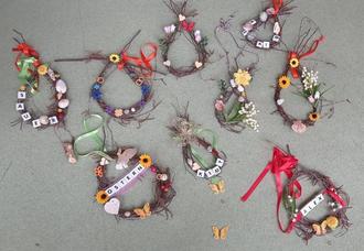 Kleine Türkränze durften die Schülerinnen und Schüler im Ganztagsangebot Handarbeit anfertigen und voller Stolz mit nach Hause nehmen. Diese kleinen Kunstwerke sind doch sehr gelungen und durch die vielen Streudeko-Spenden sehr unterschiedlich gestaltet worden.